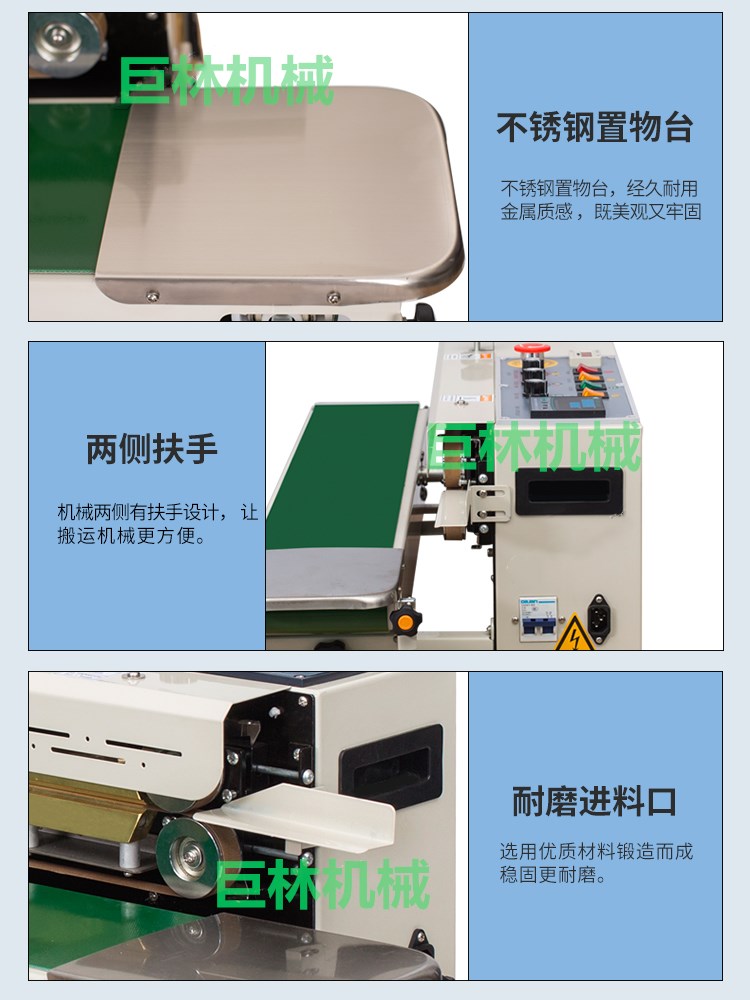 本机是新一代集印码,封口,连续输送为一体的自动薄膜封口机,具有印字清晰、顔色可选、即印即干、换字方便等特点。