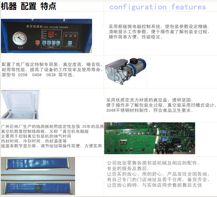 使用说明;1.插上电源插头.交流220伏.2.打开电源按扭于开位置.3.调节抽气时间(一般30-35秒左右).4.调节加热(封口)时间(一般2.5-3.5秒).5.装好物品.放置箱内在封口处.6.按(压)下顶盖(有机玻璃盖.看到真空表指针走动手松开)即可自动操作.真空表回零即工作完成.