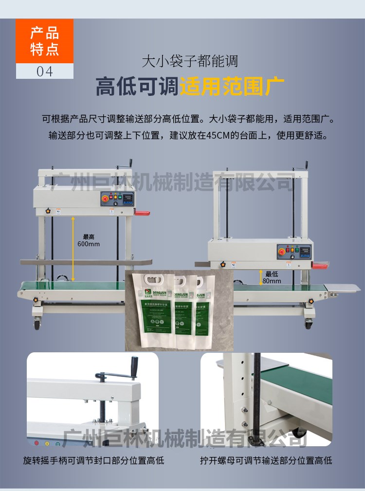 立式pe膜封口机采用立式封口,适合体型较大的物品包装,当包装物品的高度发生变化时,操作人员只需要简单摇动手柄即可使封口高度达到精准数值。